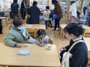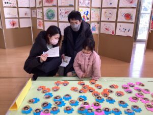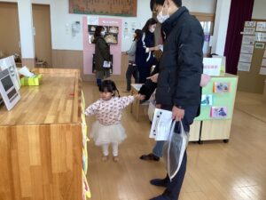 広間では子ども達の作品を5領域に沿って展示しました。お子様の作品を当てるクイズラリーでは「一回で当たった」「難しい」「予想と違った」など、親子の会話が弾み楽しそうな笑顔。
