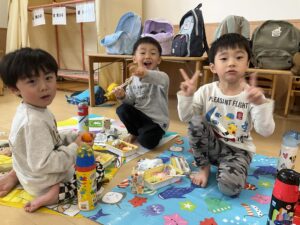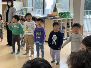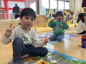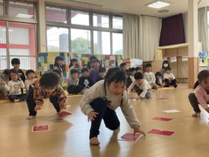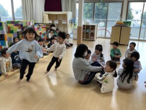 本日は、”春のすくすく散歩”で遺跡公園へ行く予定でしたが、あいにくの天候により、広間でレクリエーションを行いました。