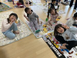 子ども達からのリクエストのハンカチ落とし。和組、愛組、太陽チーム、星チームの括りで4回戦行いました。