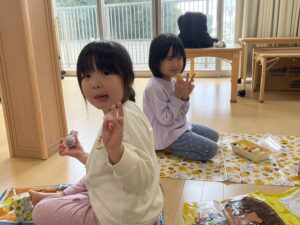 「オオカミ」がお題が出された時には、声に出しながら指で数え、4人の友だちで集まりました。人数が揃うまでドキドキしながら友だち集めをしましたが、4人揃うと嬉しそうな表情を浮かべる子ども達でした。