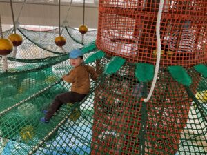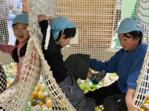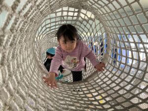 HUGHUGでは、子ども達が楽しみにしていた「HUGHUGのき」で、4階層のネットの中には雲のチューブやバランスボールなどの遊具があり大興奮でネットを駆け上り遊んでいました。