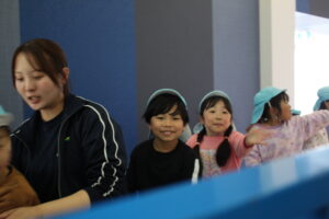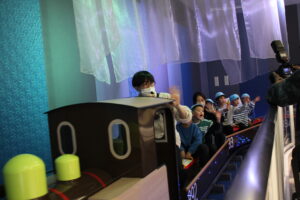 お弁当の後は、ハグハグトレインに。お弁当を食べている時に通り過ぎる度に乗りたいと言っていたミニSLに乗りました。館内2階をぐるりと走る中には、鉄橋にトンネル、光と音の演出に子ども達は「イルミネーションみたい」と喜んでいました。