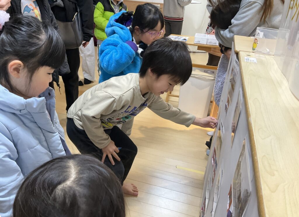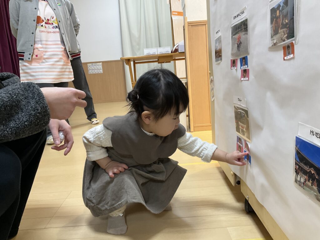 人間関係のコーナーではお友達の後ろ姿の写真を見て、「これは〇〇ちゃん!」と言って予想しながら、楽しそうにめくっていました。また「これは○○ちゃんだよ!」とお父さんやお母さんに教えて、親子で楽しむ姿も。