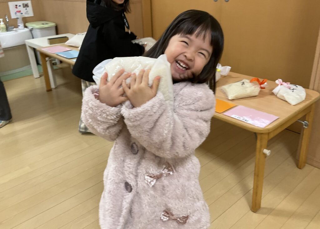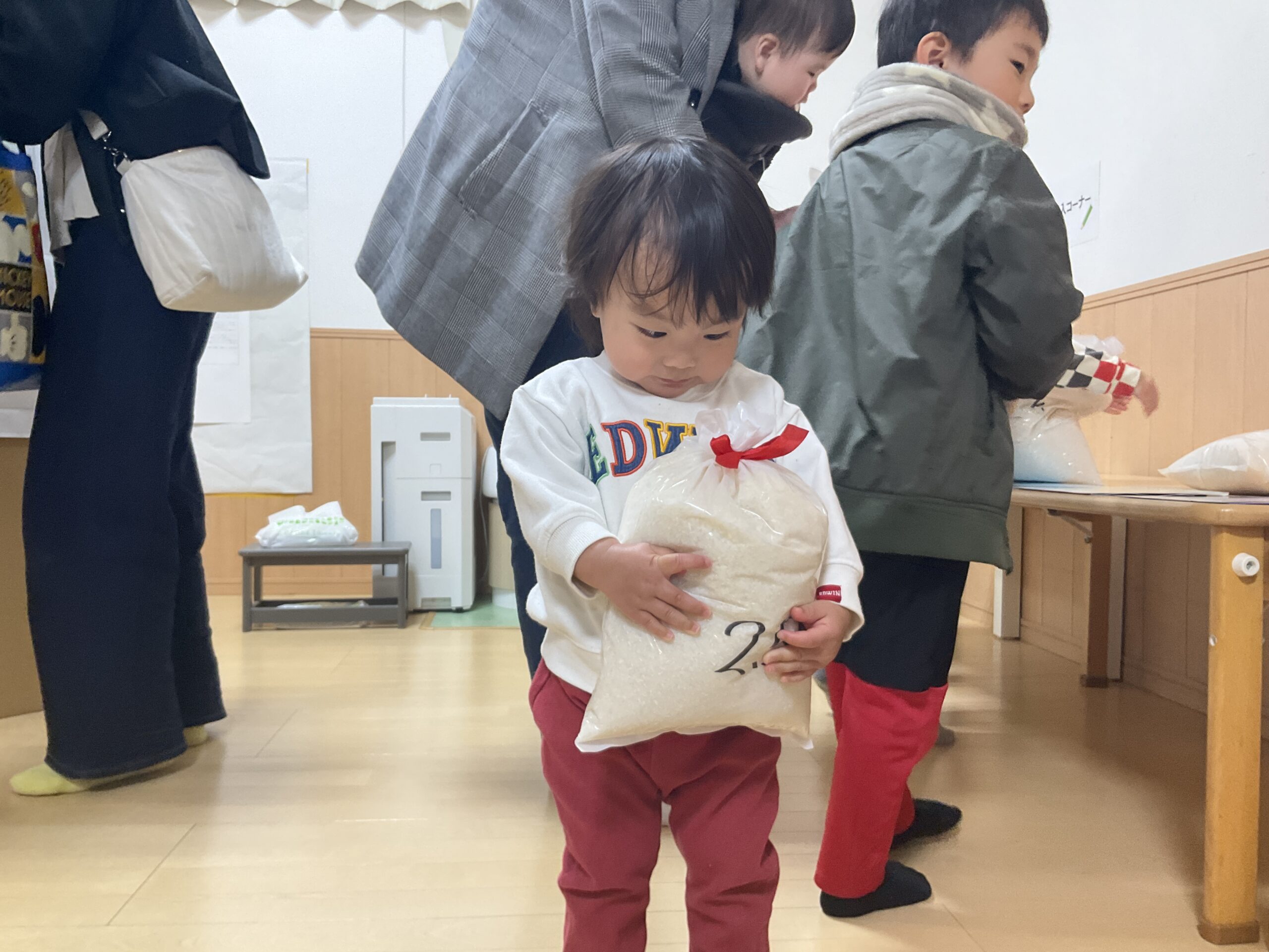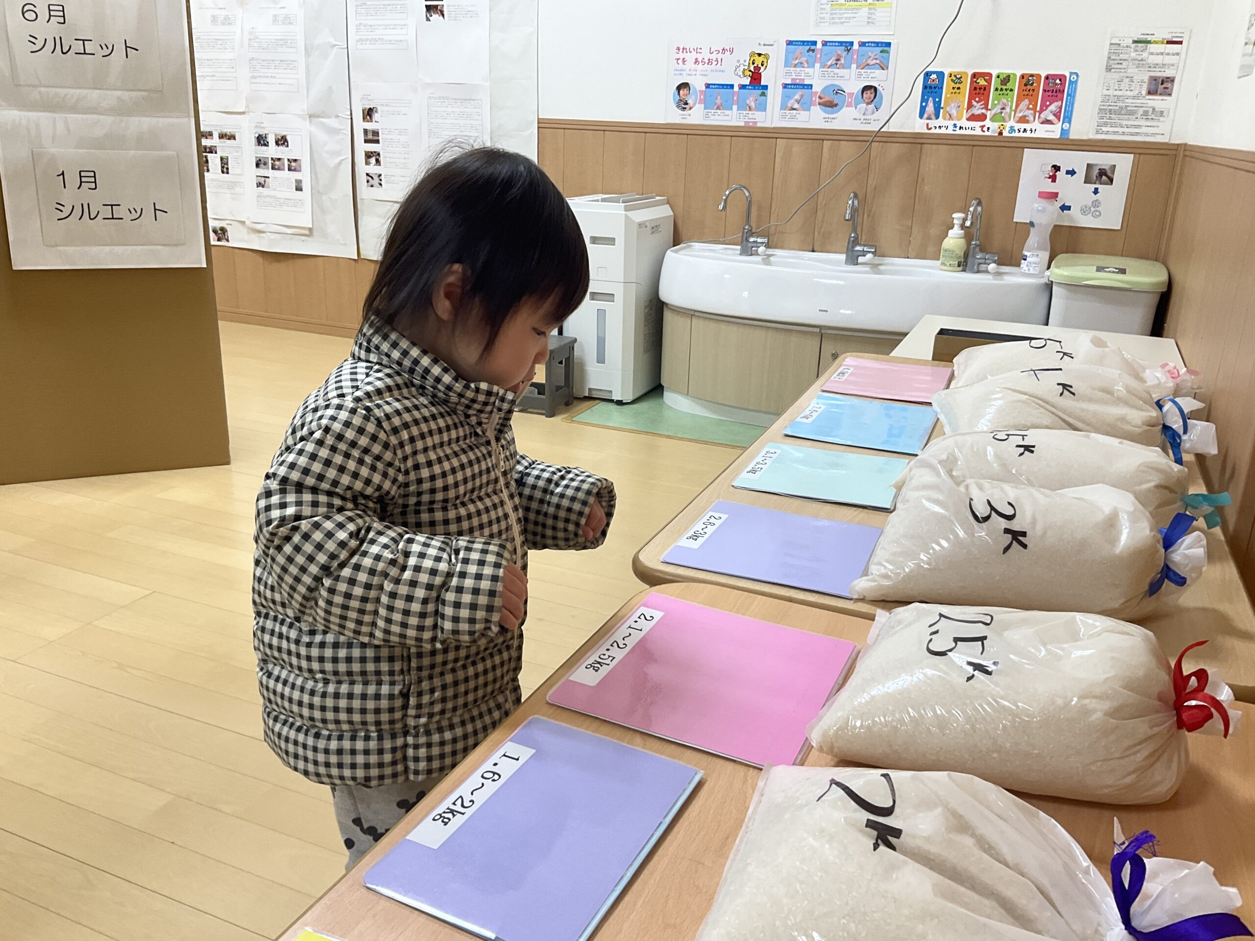 身長・体重のコーナーでは4月から今までの成長を一円玉やお米の重さに置き換えて表しました。実際にお米を持って、「重い!」「こんなに大きくなったの?」と増えた分の重さを体験し、成長に驚く子どもたち。