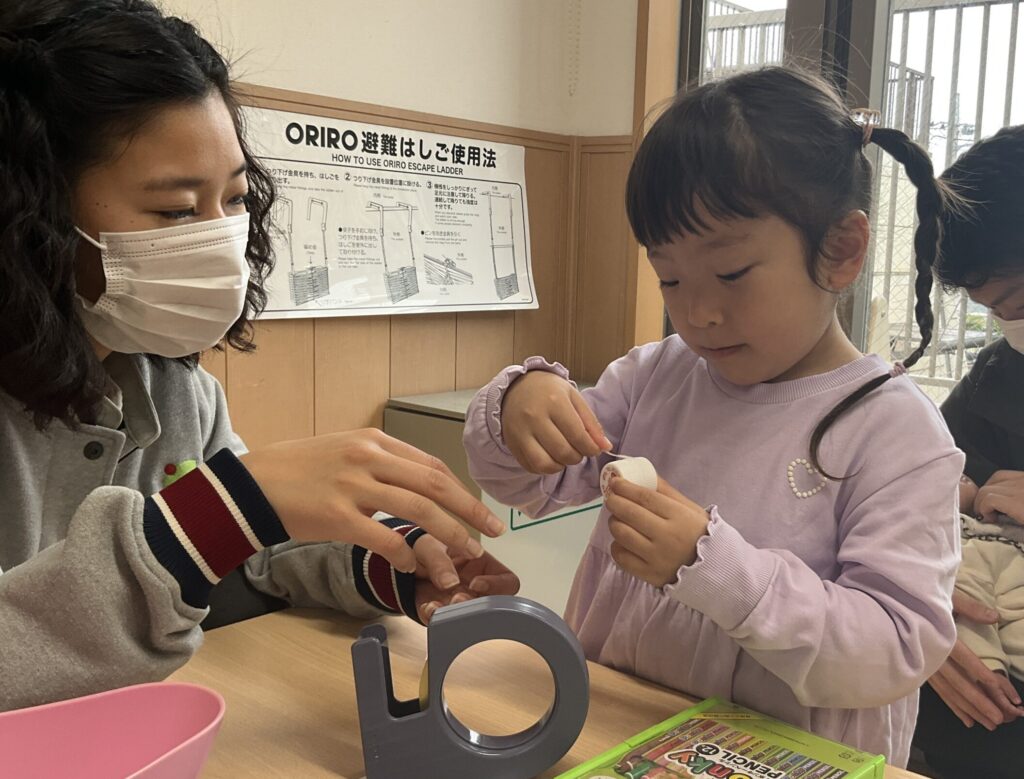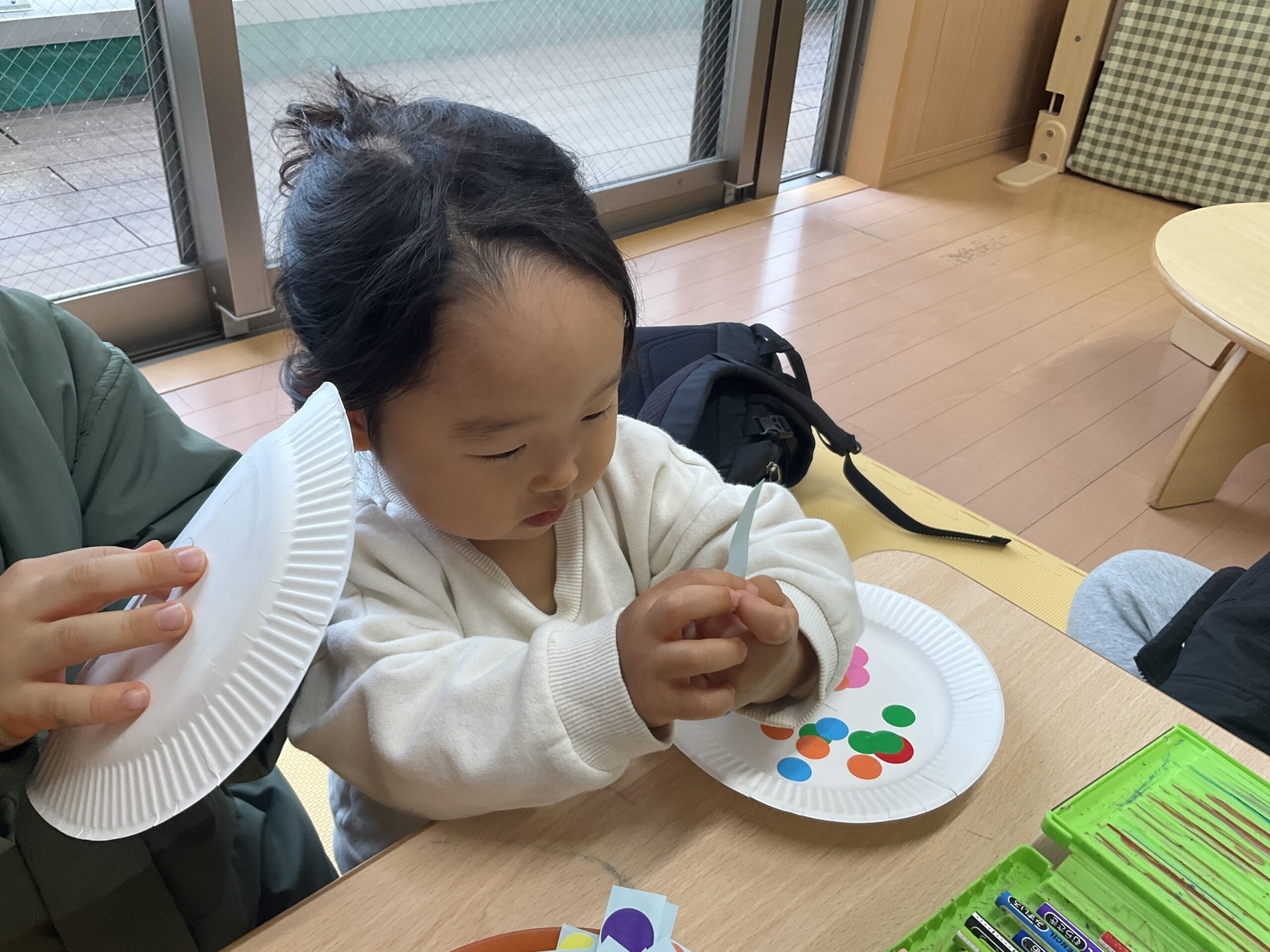 作って遊ぼうのコーナーでは様々な色のシールやペンを使い、オリジナルの紙皿コマを作りました。回してみると綺麗な模様になり、嬉しそうに何度も回して遊んでいました。